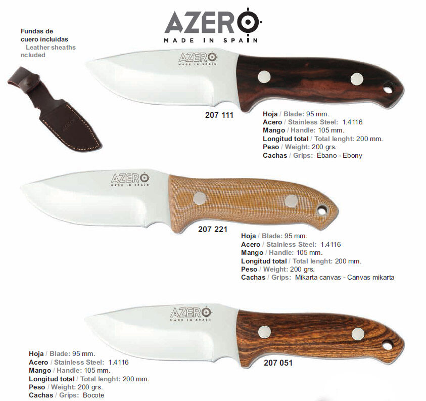 AZERO Knives - Made in Spain: Despite being only a relatively young company, Azero has a professional background of almost 30 years in the cutlery sector. They make high quality knives using steels such as ACX 380 which is known for it's increased strength, hardness, wear resistance, and toughness.