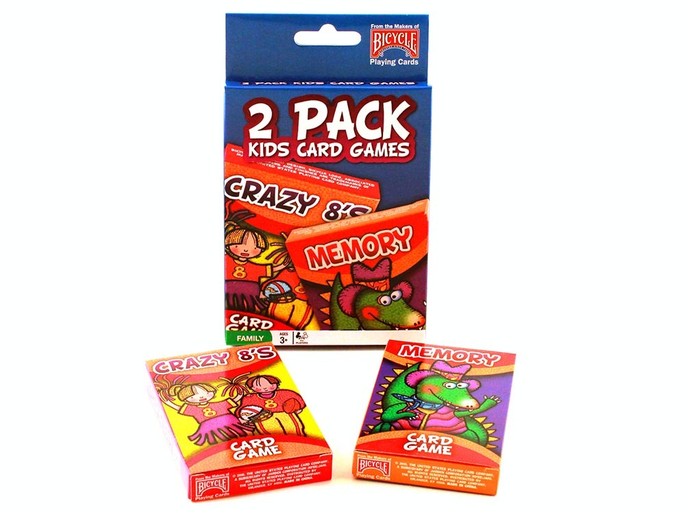 2 Pack kids card games by United States Playing Card Company, the makers of Bicycle playing cards. This pack includes two colourful card games - Crazy 8's and Memory.