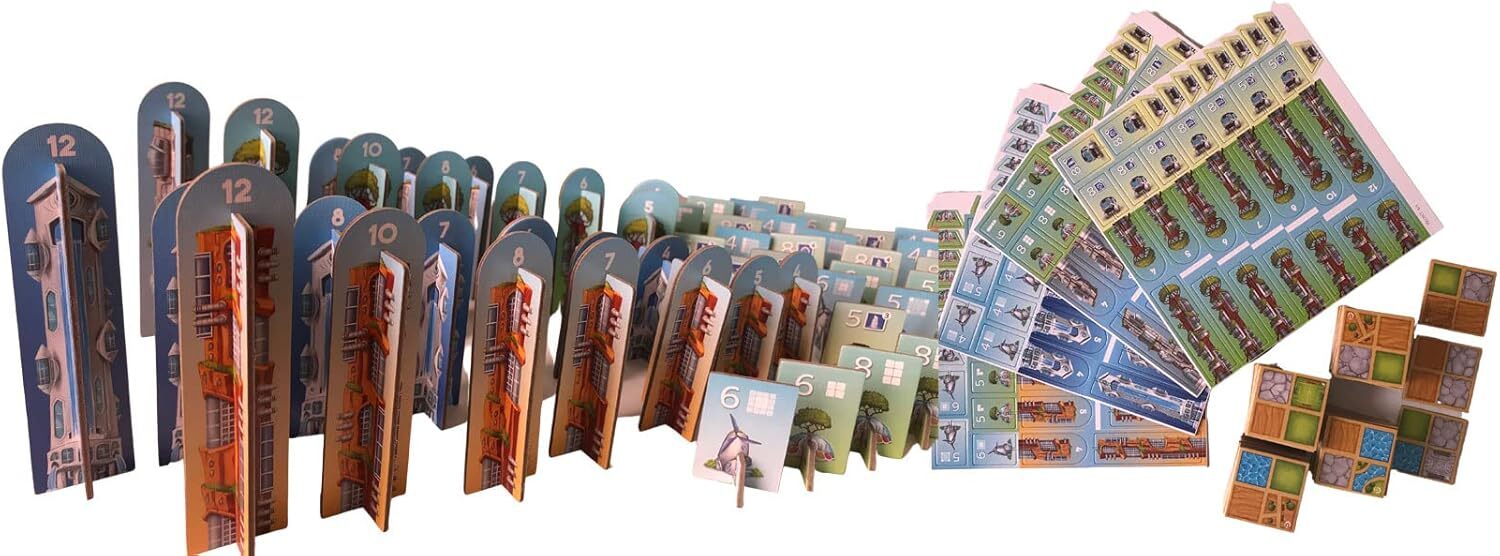 Neoville is looking for architects to build a city that is a combination of human habitation and the natural world. Are you up to the challenge? Position tiles strategically to build skyscrapers and utilities in your 44 city. Skyscrapers will be worth harmony points at the end of the game based on their value and district size. Utilities will be worth harmony points when their position in the city fits their own requirements.
