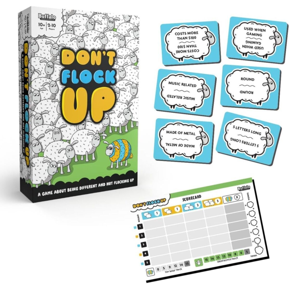 Can you be unique or are you just part of the flock? Don't Flock Up is a family party game with a simple mission: create as many connections between category cards as possible, without making the same connections as anyone else. Six cards are played in each round and players will have 60 seconds to try to find as many connections as possible among the cards and write them down.