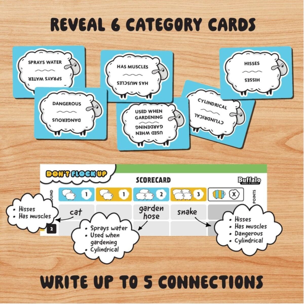 - Try and connect as many cards as possible to a single word, but lose points if you flock up and give the same answers as other players