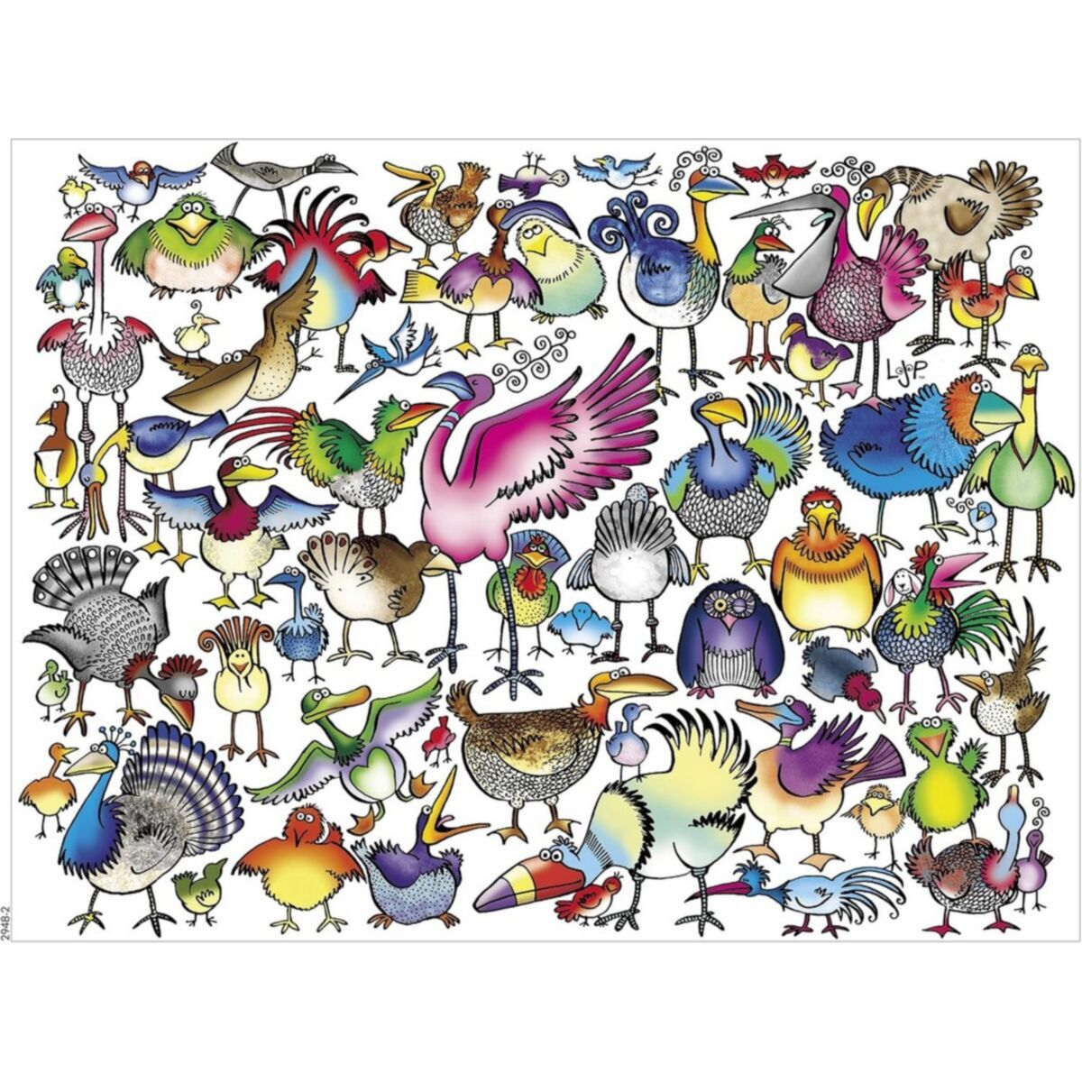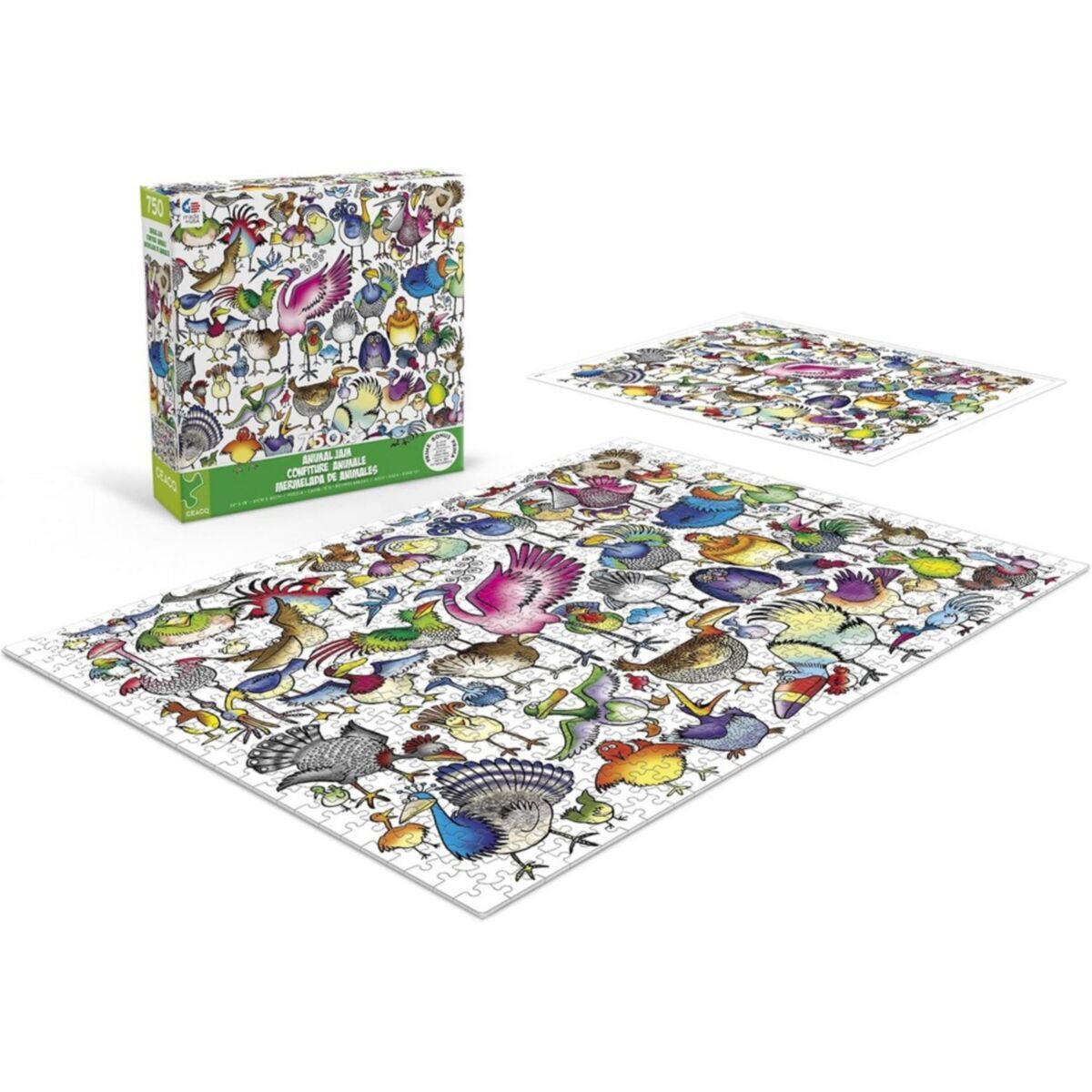 Ceaco Animal Jam: Birds Galore Jigsaw Puzzle by Lynn Johnston. Unique random shaped pieces, made with recycled materials, make up a 61cm x 46cm puzzle when completed. Includes a Bonus puzzle poster.