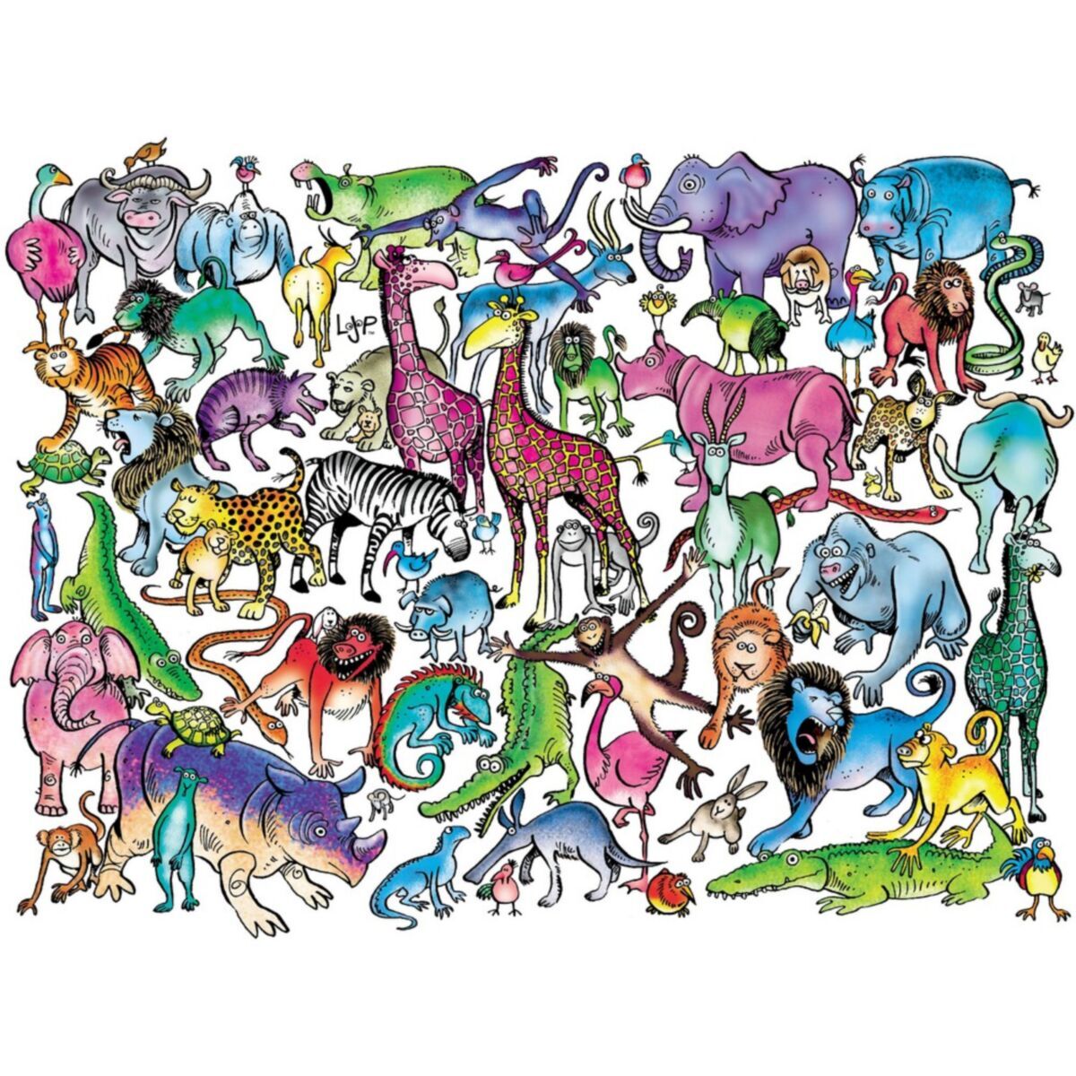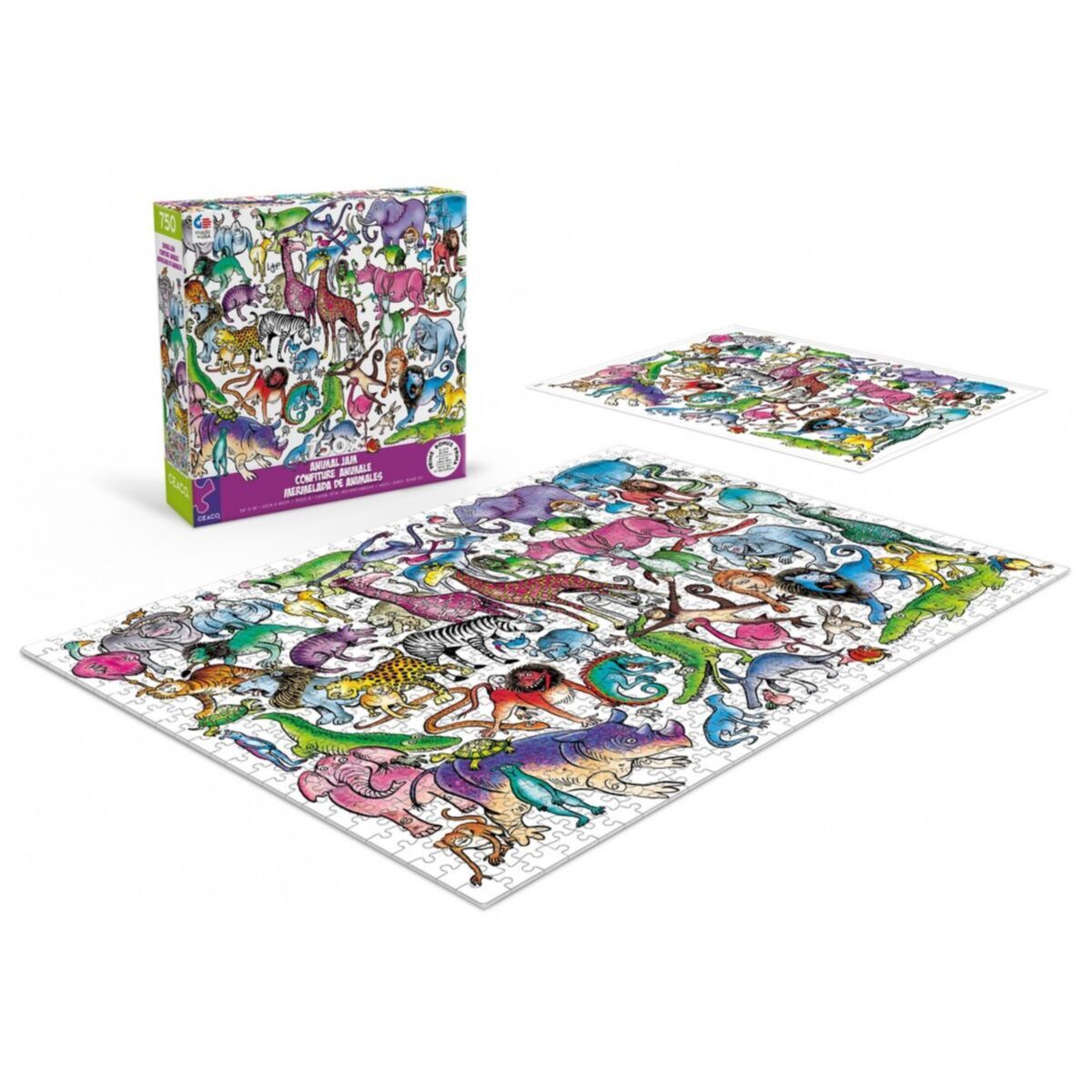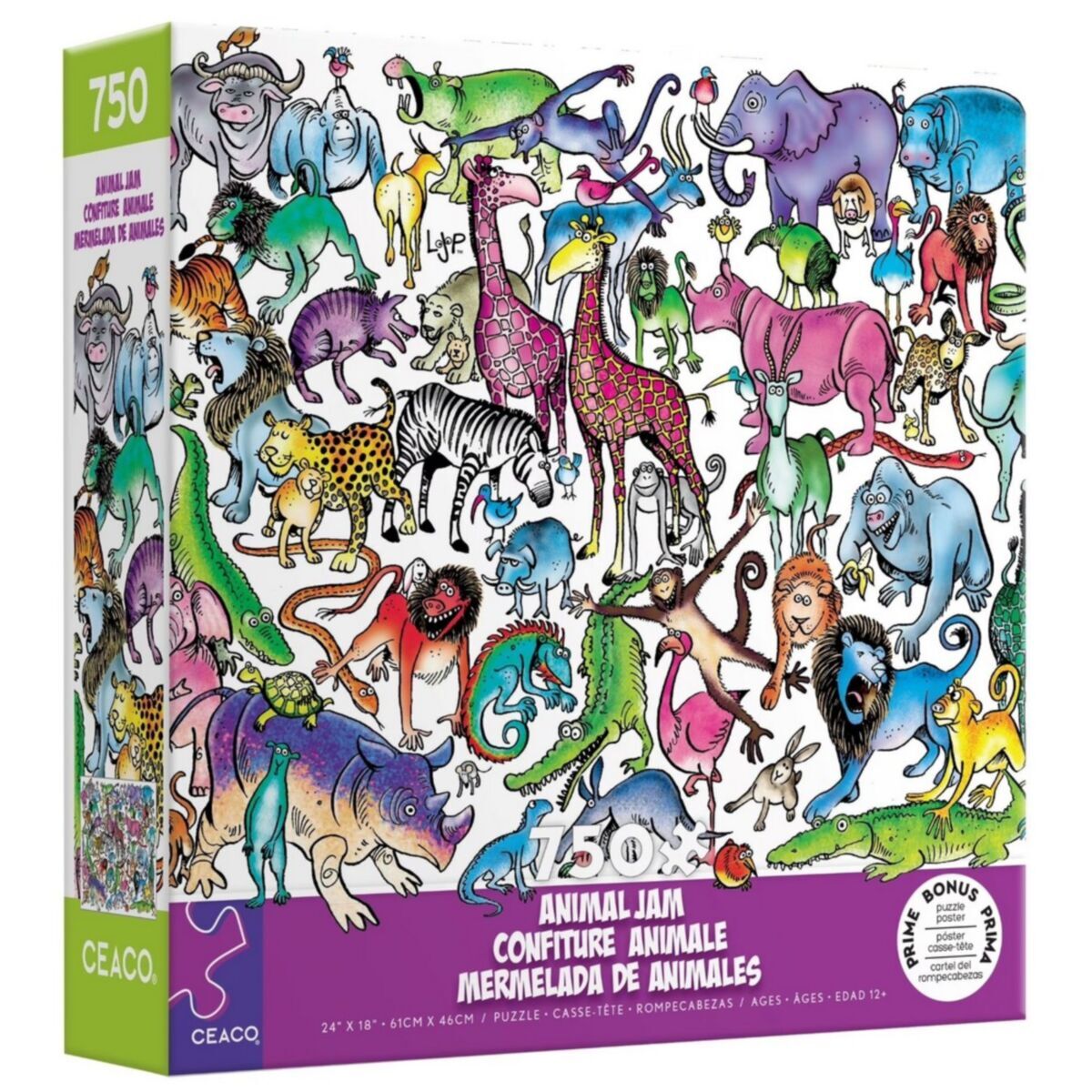 A colorful 750 piece interlocking jigsaw puzzle from Ceaco's Animal Jam Collection, featuring Zoo Time from Lynn Johnston. Ceaco puzzles and packaging are manufactured from recycled paper products. Count on Ceaco for the most creative, exciting and colorful puzzles since 1987! Bonus poster included in box.