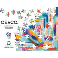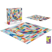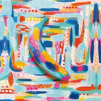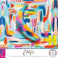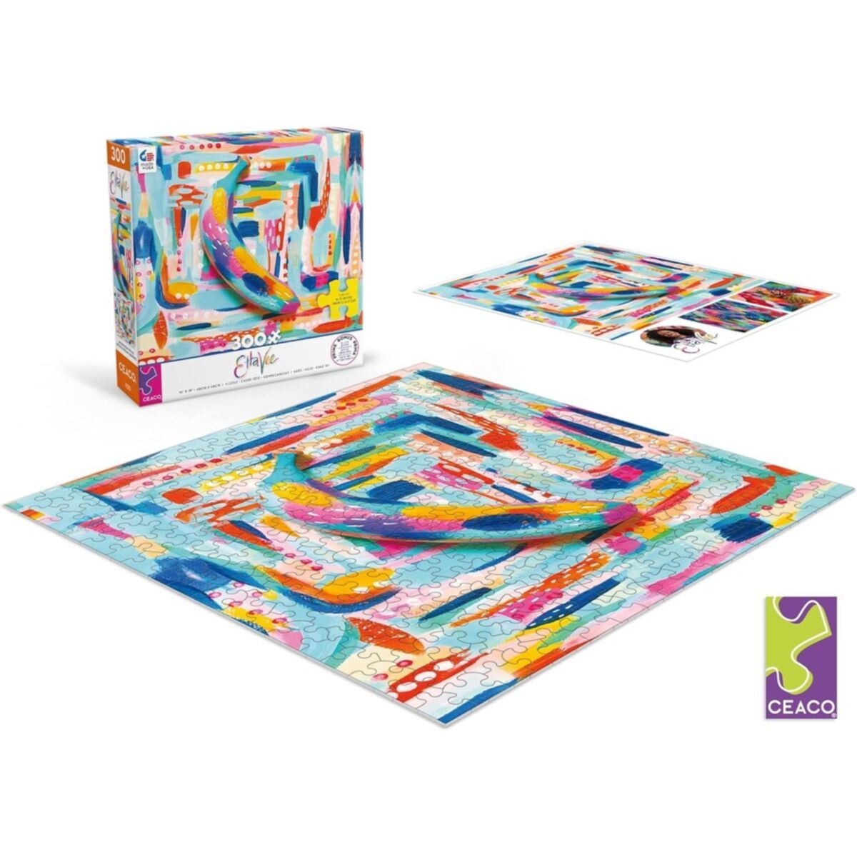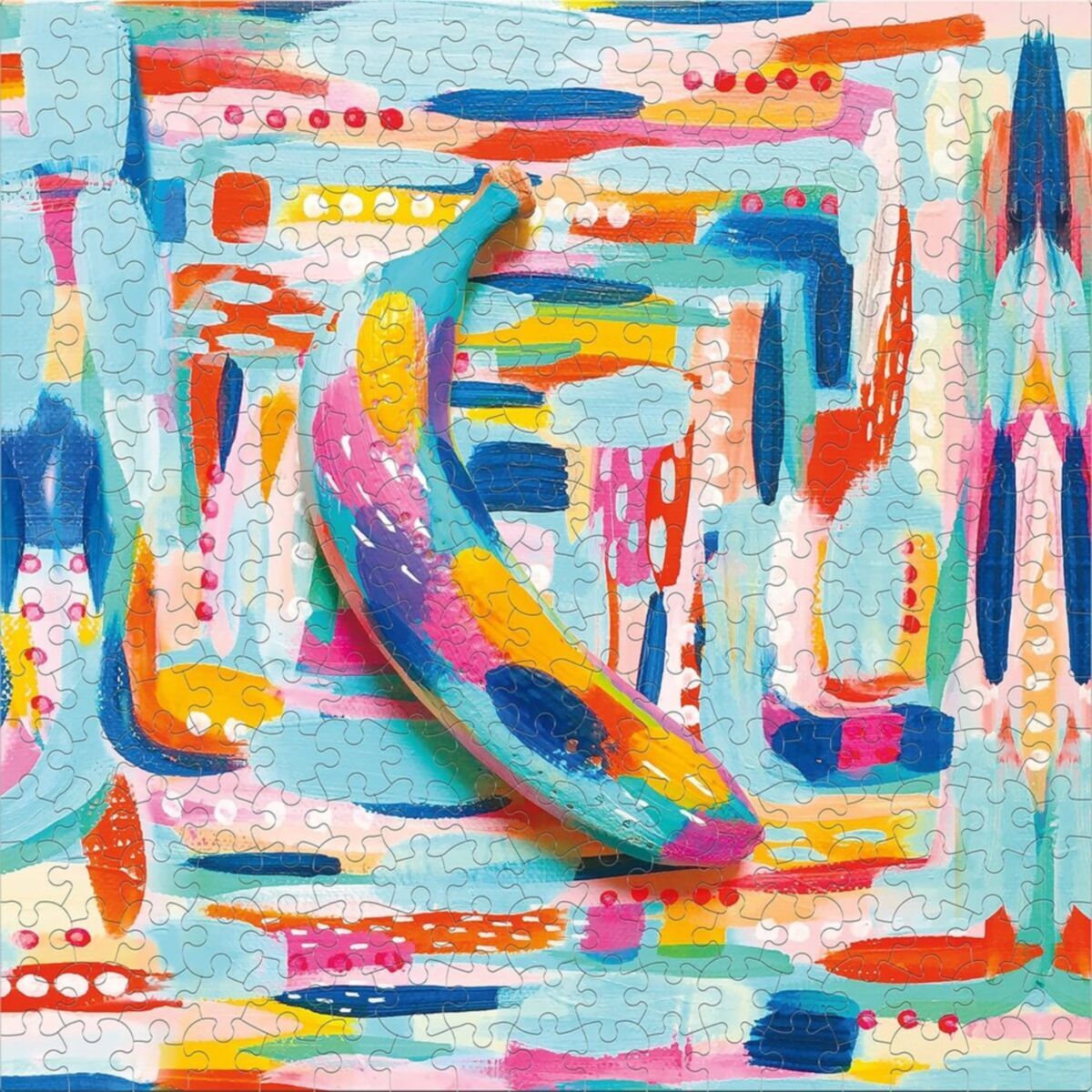 This 300 oversized piece Etta Vee puzzle features a bold and vibrantly colorful abstract pattern with a banana in the center.