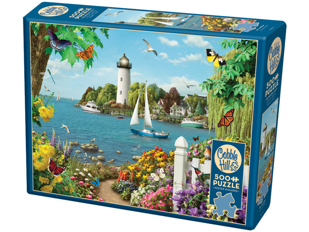 The lighthouse keeper, birds and butterflies By the Bay watch the sailboat sail away. Cobble Hill's 500 piece puzzles have large size random cut pieces and it includes a reference poster to help in your adventure! Cobble Hill was founded in 2005 with a desire to bring loving, whimsical, high-quality images to puzzle enthusiasts around the world! Our puzzles have been described as nostalgic, lively, endearing, sweet, durable, and fine quality.