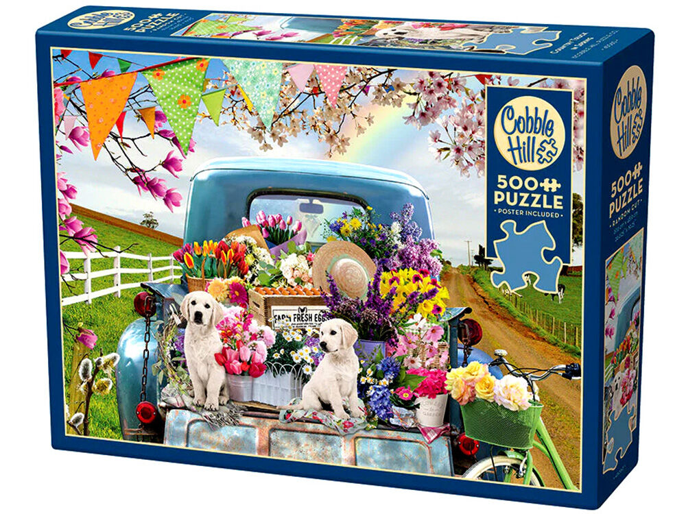 The Country Truck in Spring is full of colour with beautiful flowers, ribbons, and rainbows! A cheerful 500 piece puzzle equipped with cuddly puppies. Cobble Hill was founded in 2005 with a desire to bring loving, whimsical, high-quality images to puzzle enthusiasts around the world! Our puzzles have been described as nostalgic, lively, endearing, sweet, durable, and fine quality.