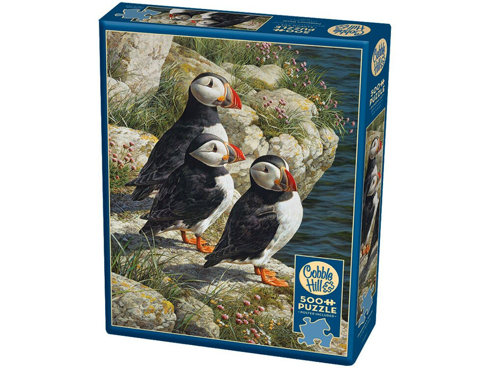 What are these three cute little puffins doing at "Fisherman's Wharf"? A beautiful 500 piece nature puzzle by Carl Brenders. Cobble Hill was founded in 2005 with a desire to bring loving, whimsical, high-quality images to puzzle enthusiasts around the world! Our puzzles have been described as nostalgic, lively, endearing, sweet, durable, and fine quality.