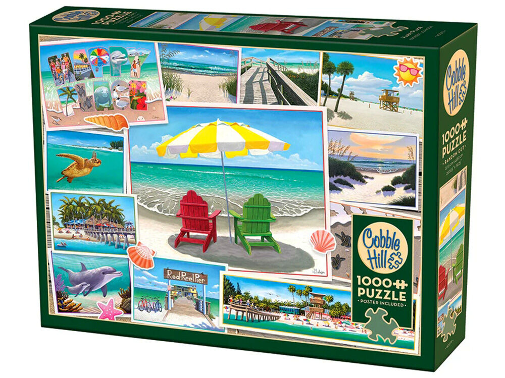 For so many, their Happy Place is a sunny day on the beach. Umbrellas up, chairs out, a stroll on the pier with the hopeful possibility of seeing sea life. Would you be happy to receive a postcard from this serene beach scene or would you rather be there in person? A 1000 piece scenic beach collage puzzle. Cobble Hill was founded in 2005 with a desire to bring loving, whimsical, high-quality images to puzzle enthusiasts around the world! Our puzzles have been described as nostalgic, lively, endearing, sweet, durable, and fine quality.