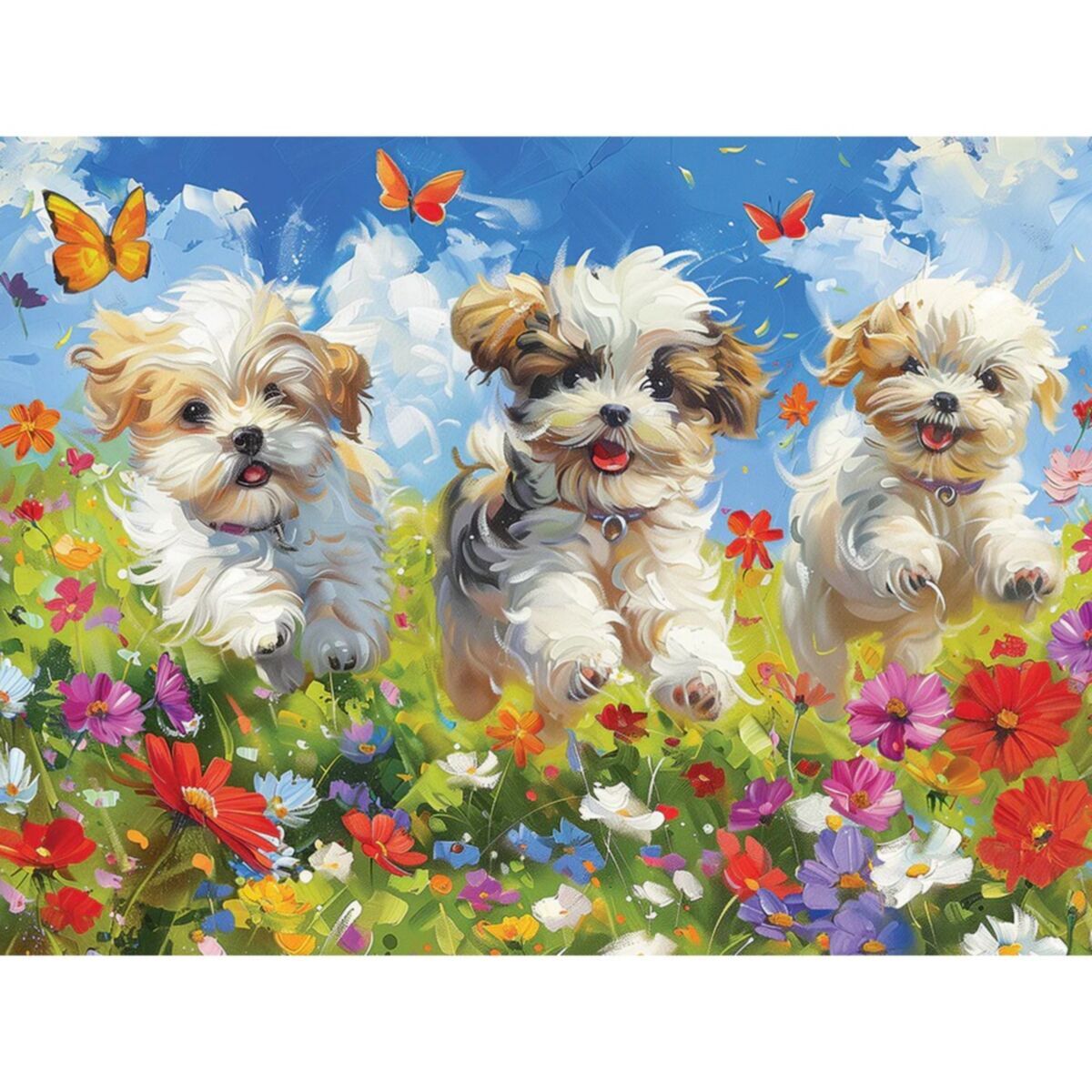 Here comes Joy! Three playful puppies race through floral fields with high energy. Even the butterflies have trouble keeping up with these furry friends. It's all blue skies and smiles on this joyous day outdoors. Easy Handling 275 piece puzzles feature larger sized pieces that are easy to pick up - great for anyone needing to improve their pincer skills. At 275 pieces, this is a perfect pick for a date night activity with a friend or a delightful solo activity for novice and experienced puzzlers alike.