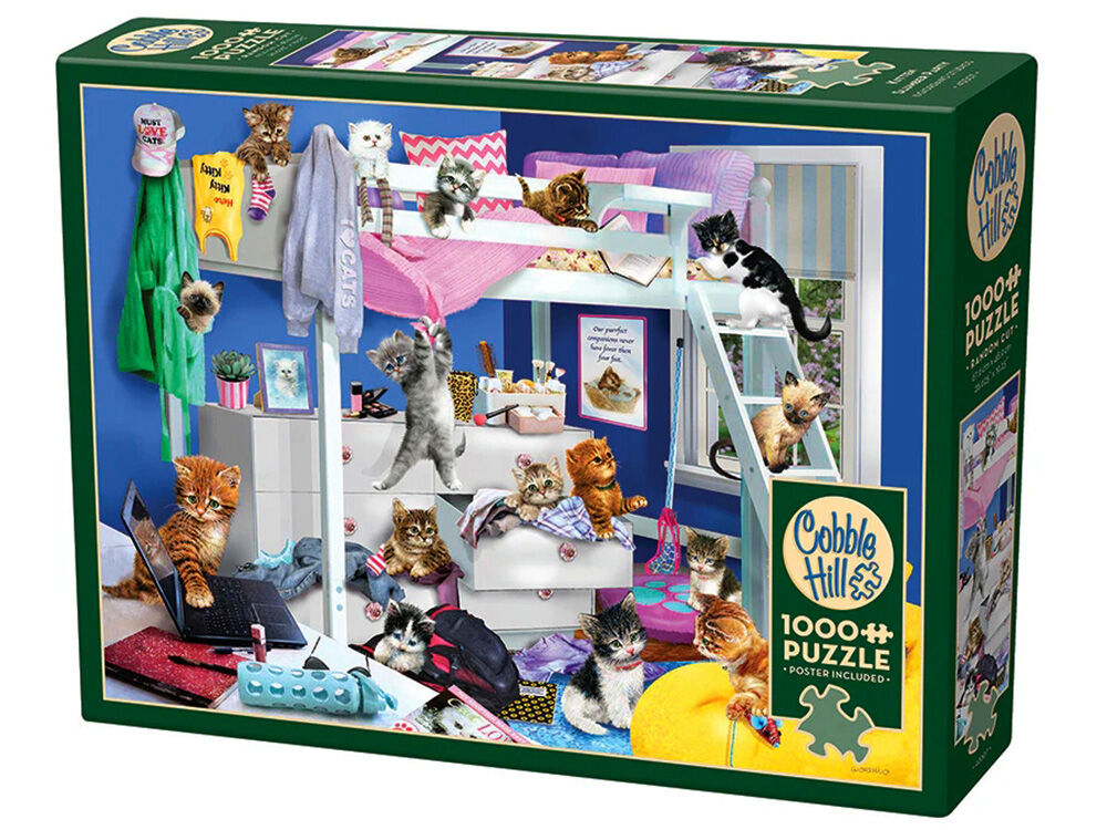 This 1000 piece puzzle by Robert Giordano transforms a girl's untidy room into a fun-filled feline playground. A purr-fect puzzle for any cat lover. Cobble Hill was founded in 2005 with a desire to bring loving, whimsical, high-quality images to puzzle enthusiasts around the world! Our puzzles have been described as nostalgic, lively, endearing, sweet, durable, and fine quality.