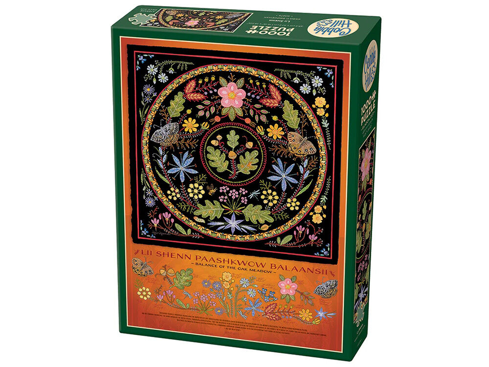 Entwined florals, mirrored design, and the depiction of life stages evoke the beautiful glass beadwork and quillwork of the artist's ancestors, the M'tis Flower Beadwork People. By Kristi Bridgeman. Cobble Hill puzzles have been described as nostalgic, lively, endearing, sweet, durable, and fine quality.