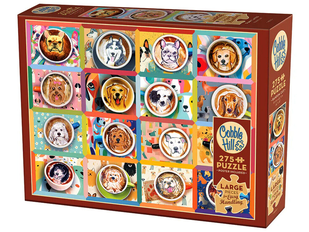 Puppy Lattes is a heartwarming 500 piece puzzle that showcases puppies of all breeds, each beautifully rendered in latte art and framed in its own charming space. Surrounded by colourful, playful backgrounds, every scene radiates warmth and personality, making this puzzle a delightful treat for dog lovers and coffee enthusiasts alike.
