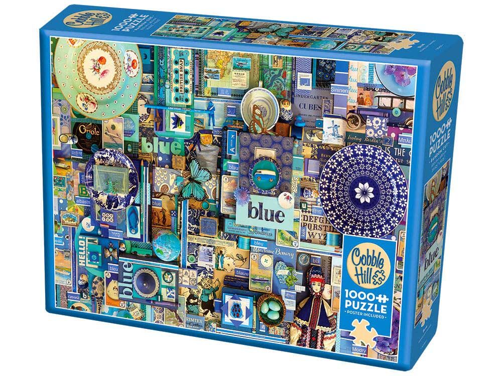 This special 1000 piece puzzle by artist Shelley Davies celebrates all things Blue. It's one in a series of seven puzzles that make up a rainbow theme when all are completed and aligned next to each other, spanning 15.5 feet. Ribbons of the word, "blue" are spelled out in multiple languages, along with vintage knick knacks and a pencil with the artist's name on it. Roses are red, violets are blue..this could be a good Valentine's or Easter puzzle too. The Rainbow Collection is a unique puzzle designed and photographed exclusively for Cobble Hill.