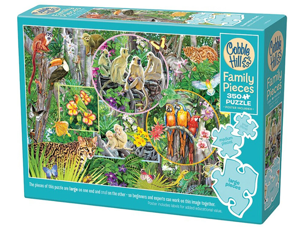 There are a lot of wild animals to discover in Rainforest Magic Family Pieces 350 puzzle by Rosiland Solomon. Some of them may be camouflaged in the green fauna, but if you look closely in the square collage, there is a bird perfectly blended with the flowers. Cobble Hill was founded in 2005 with a desire to bring loving, whimsical, high-quality images to puzzle enthusiasts around the world! Our puzzles have been described as nostalgic, lively, endearing, sweet, durable, and fine quality.