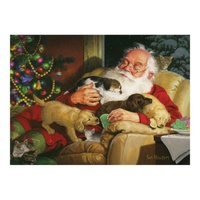 Santa's Quiet Time is the perfect moment to unwind, and what better way to do so than curled up in his favorite comfy recliner with a bunch of cuddly puppies and kittens! It's all peace and calm - well, almost! One little mischievous puppy has its eye on Santa's sugar cookie and is just about to take a sneaky nibble. Who could blame the little guy? It's hard to resist a sweet treat in such a cozy setting. This heartwarming 1000 piece puzzle captures all the charm of a perfect holiday nap with a dash of playful fun!