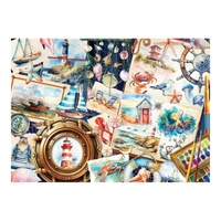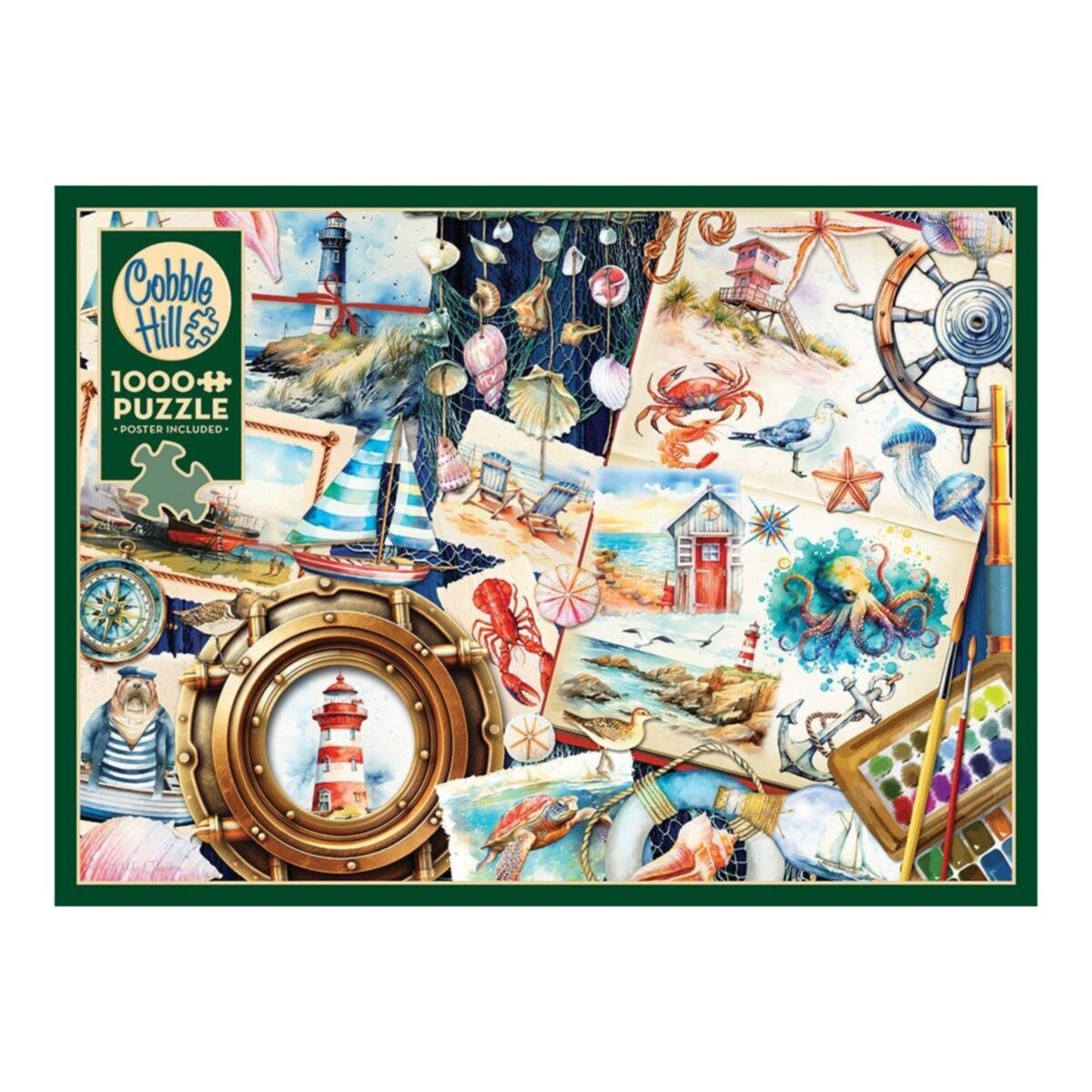 Seashore Sketchbook brings maritime charm to life with delightful watercolor illustrations of sea creatures. From crabs, lobsters, and octopuses to sea turtles, jellyfish, and an adorable walrus dressed as a sailor, this puzzle is brimming with coastal whimsy! Adorned with seashells and ships, it offers a playful glimpse into life by the lighthouse.