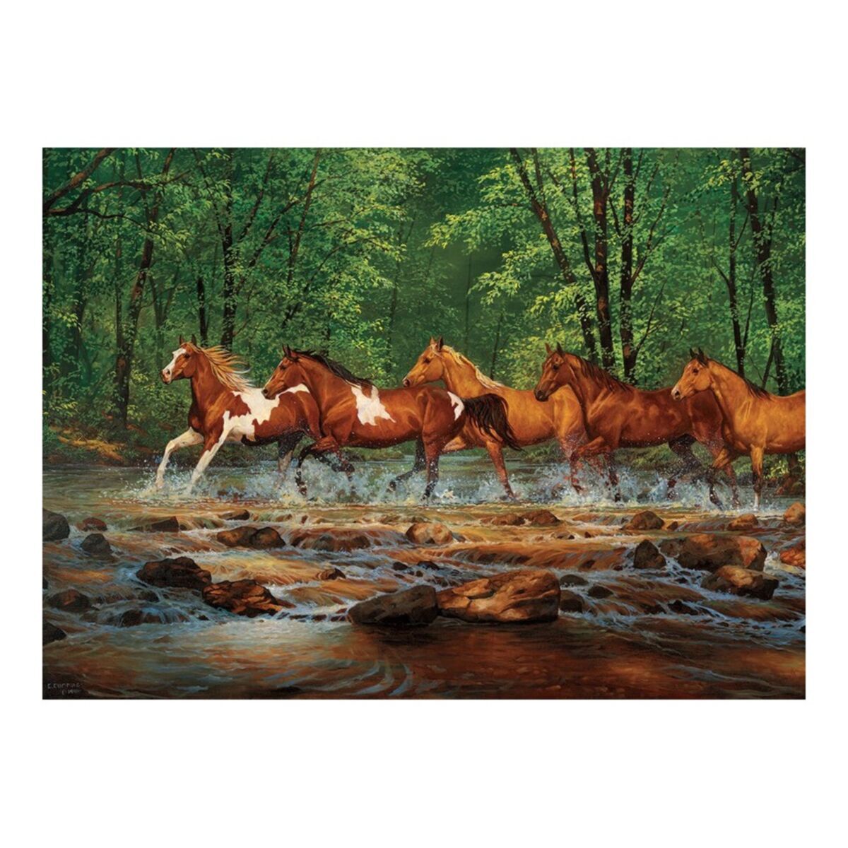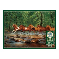 The horses are off on their Spring Creek Run, ready to gallop through the forest to reach lush fields on the other side! This 1000 piece puzzle by artist Chris Cummings captures the spirit of wild beauty and freedom, showcasing majestic horses in a breathtaking natural landscape. Perfect for wildlife and nature lovers, each piece brings you closer to the thrill of the open fields and the heart of freedom!