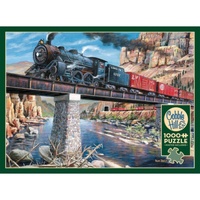 Feel the power of Stone Steel and Steam, a Santa Fe train crossing a bridge over water on a blue sky day. Even with the train's bell ringing and the roaring sound of the steam train, this picturesque place feels peaceful. This 1000 piece puzzle is a painting from Ken Zylla.