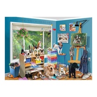 This delightful 1000-piece puzzle by Robert Giordano showcases an adorable scene of playful puppies in a vibrant art studio. Each puppy is captured in charming detail, whether they are exploring art supplies, taking naps in curious places, or simply looking irresistibly cute. The colorful and whimsical setting, combined with the puppies' antics, makes this puzzle a joy to assemble.