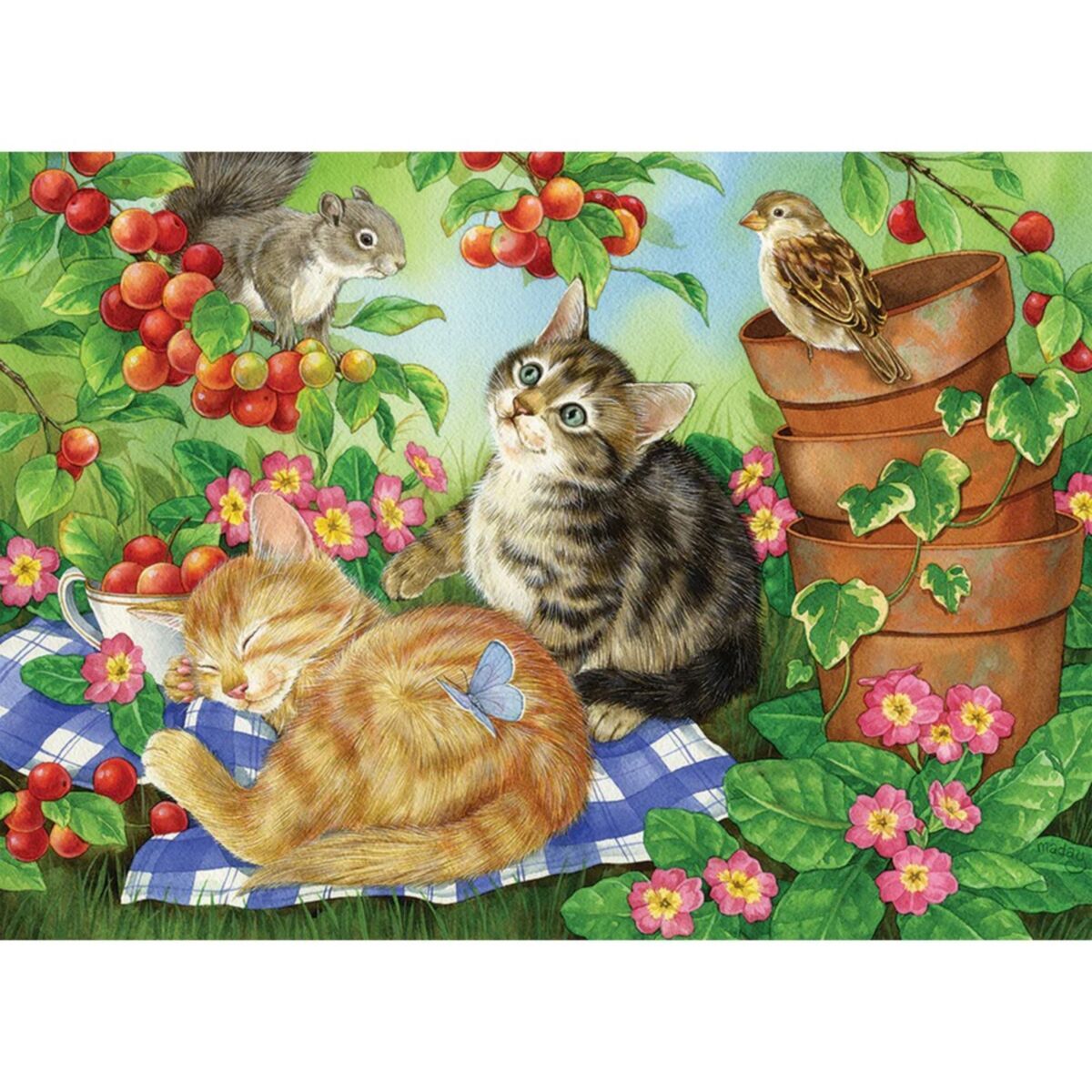 Under the Cherry Tree you'll make a sweet discovery! Cute little kittens have found a resting place, while the birds and squirrels have come to join them. It's a cozy spot on the grass and we're sure you'll enjoy spending with them too.