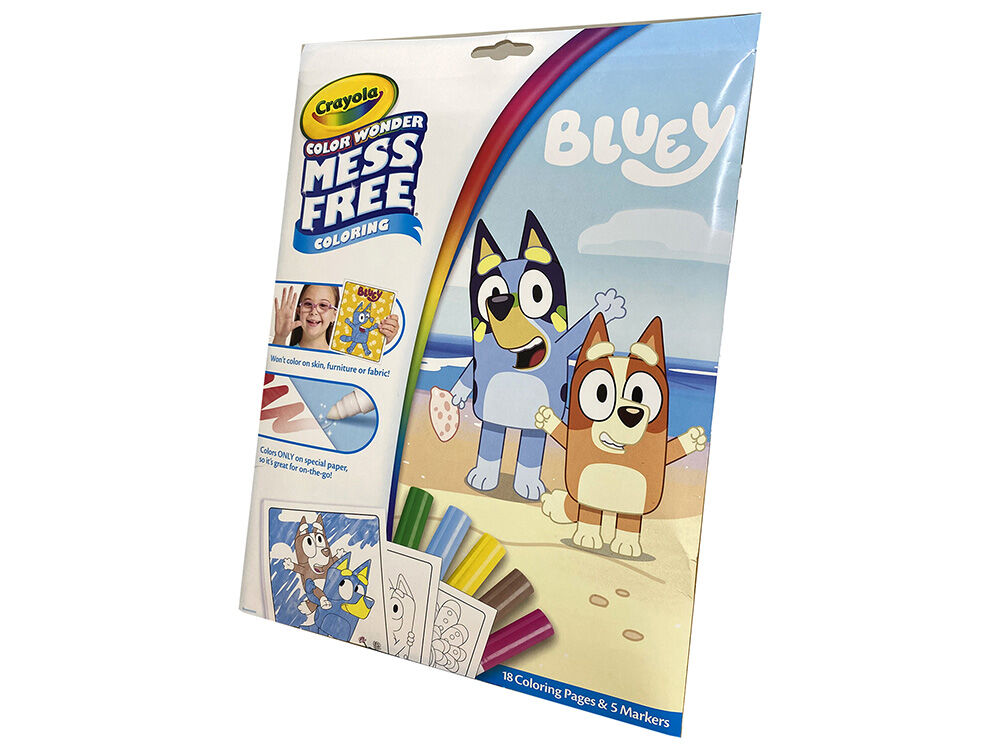 Crayola Colour Wonder Mess Free Colouring - with a Bluey theme. Won't colour on skin, furniture or fabric. Colours only on special paper, so it's great for on-the-go! 18 colouring pages and 5 markers.