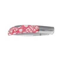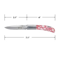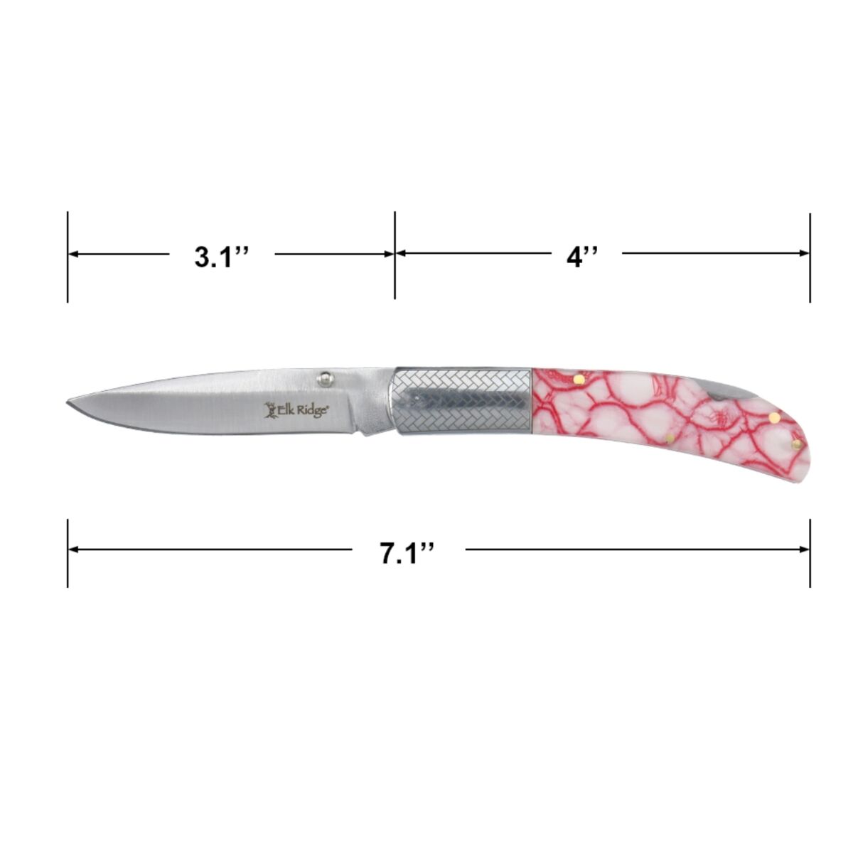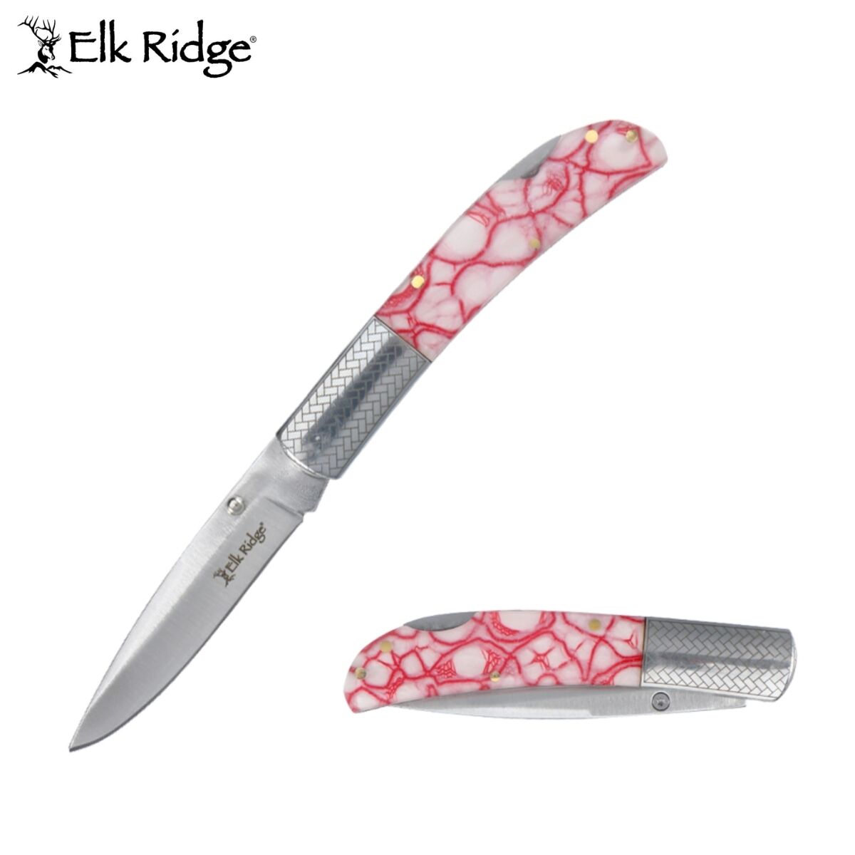 Elegant Elk Ridge Manual Folding Knife with a satin stainless steel blade and striking rose-colored POM handle, perfect for stylish outdoor adventures.