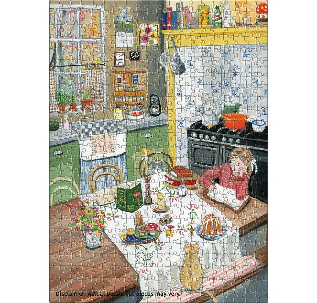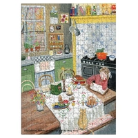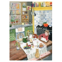 Settle into a cozy country kitchen where a youngster tackles homework beside warm lamplight, a vintage stove, fresh flowers, and a curious cat. This Oversize 500-piece puzzle uses large, easy-to-grip pieces for comfortable, satisfying assembly and a bright, storybook illustration that's relaxing to build. Printed with premium inks on sturdy, precision-cut board—perfect for an evening unwind or family puzzling time.