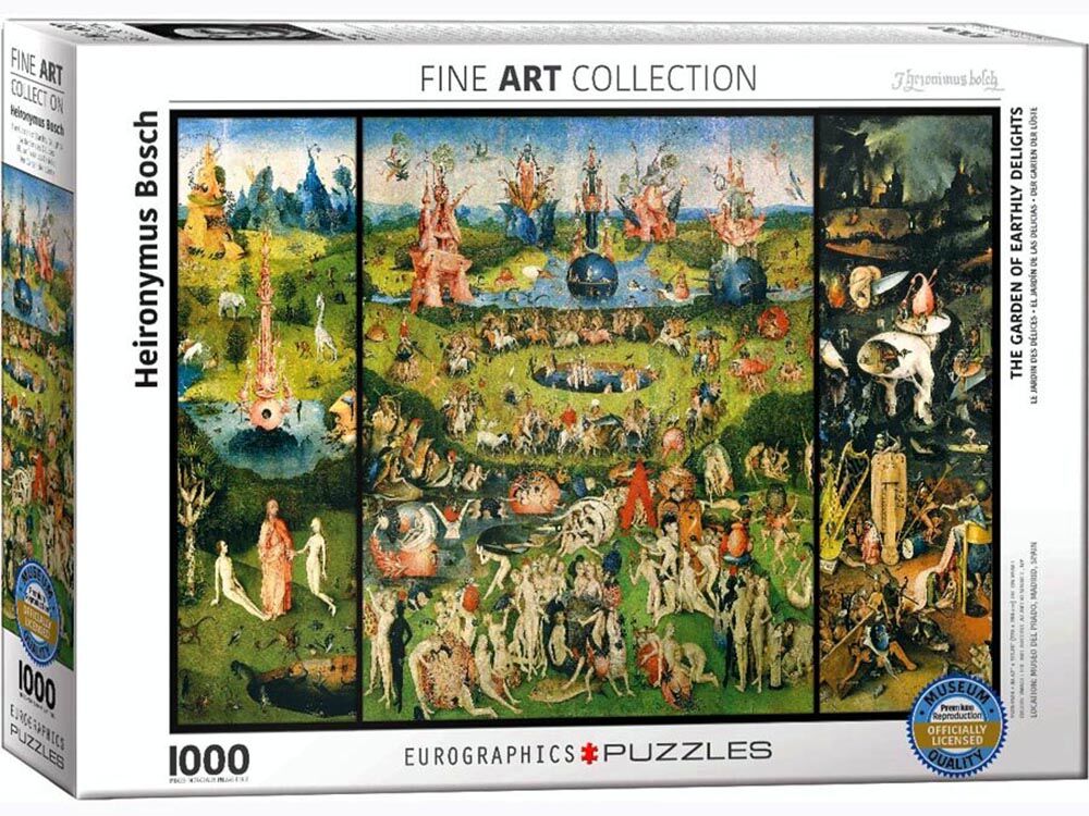 The Garden of Earthly Delights by Hieronymus Bosch 1000-Piece Puzzle. Hieronymus Bosch is a Dutch artist whose pen name comes from his birthplace. The Garden of Earthly Delights is his most famous work consisting of a few triptych altarpieces.
