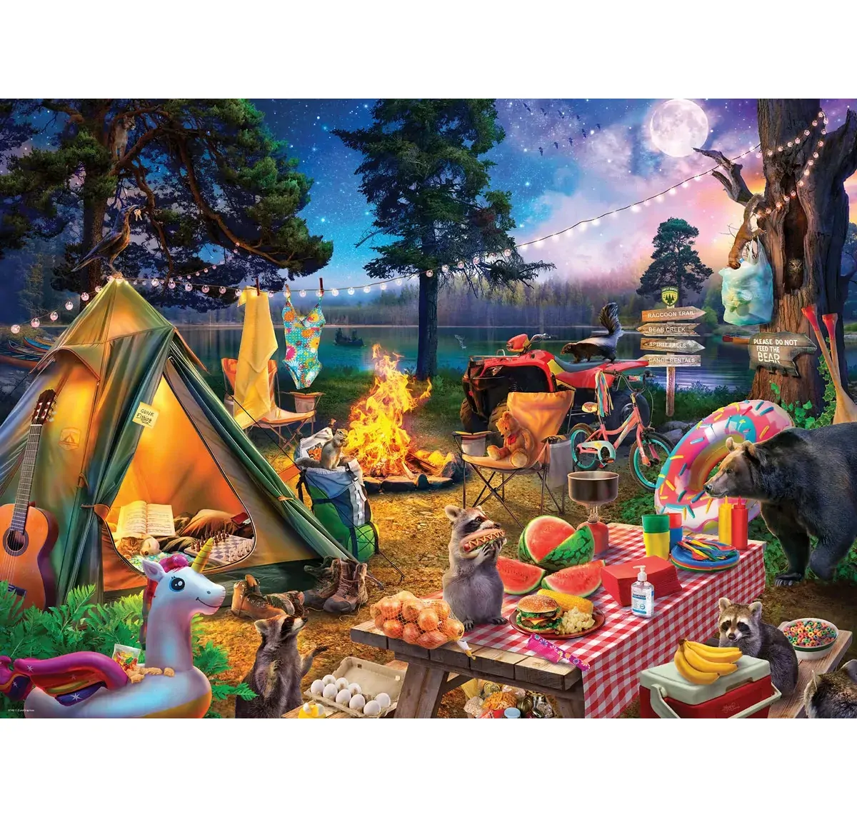 Pitch your tent by the lake and dive into the chaos-and-charm of "Camping Life." This extra-large piece puzzle bursts with campfire glow, twinkle lights, canoes, bikes and a picnic table piled high - while mischievous raccoons (and a curious bear!) sneak a snack. With 300 oversized pieces designed for an easier grip and a satisfying fit, it's perfect for relaxed, screen-free family time.
