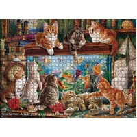 Bring a burst of whiskers, bubbles, and bright colors to your table with Cats by the Aquarium, a 1000-piece jigsaw puzzle that cat lovers will adore. A group of curious kittens gathers around a sparkling aquarium, mesmerized by shimmering goldfish and exotic tropical fish. From fluffy tabbies on the bookshelf to a brave paw dipping toward the water, every corner of the scene is packed with playful details to discover.