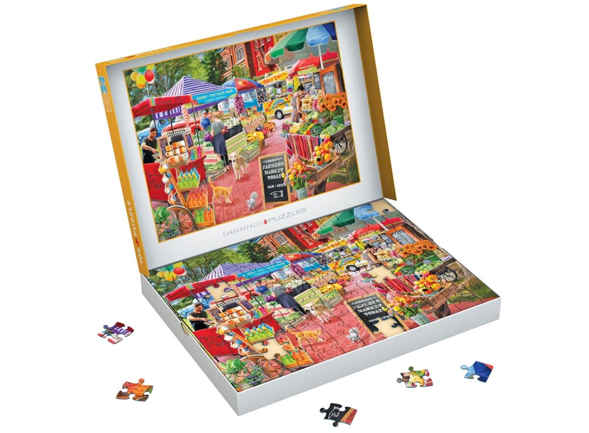 Step into the vibrant world of local produce, fresh flowers, and handcrafted delights with the A Day at the Farmer's Market puzzle from the Eurographics Connecting Pieces Collection. With 104 pieces, this puzzle offers the perfect combination of fun and challenge for puzzle enthusiasts of all ages. The delightful market scene, with bustling vendors and fresh goods, captures the essence of a sunny community market day. Its extra-thick pieces ensure easy handling, while the full image printed inside the box lid serves as a handy guide during assembly. Whether you're a beginner or an experienced puzzler, this puzzle guarantees hours of relaxing entertainment.