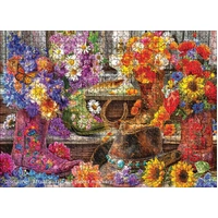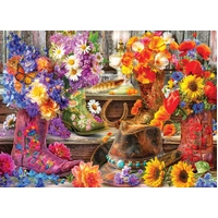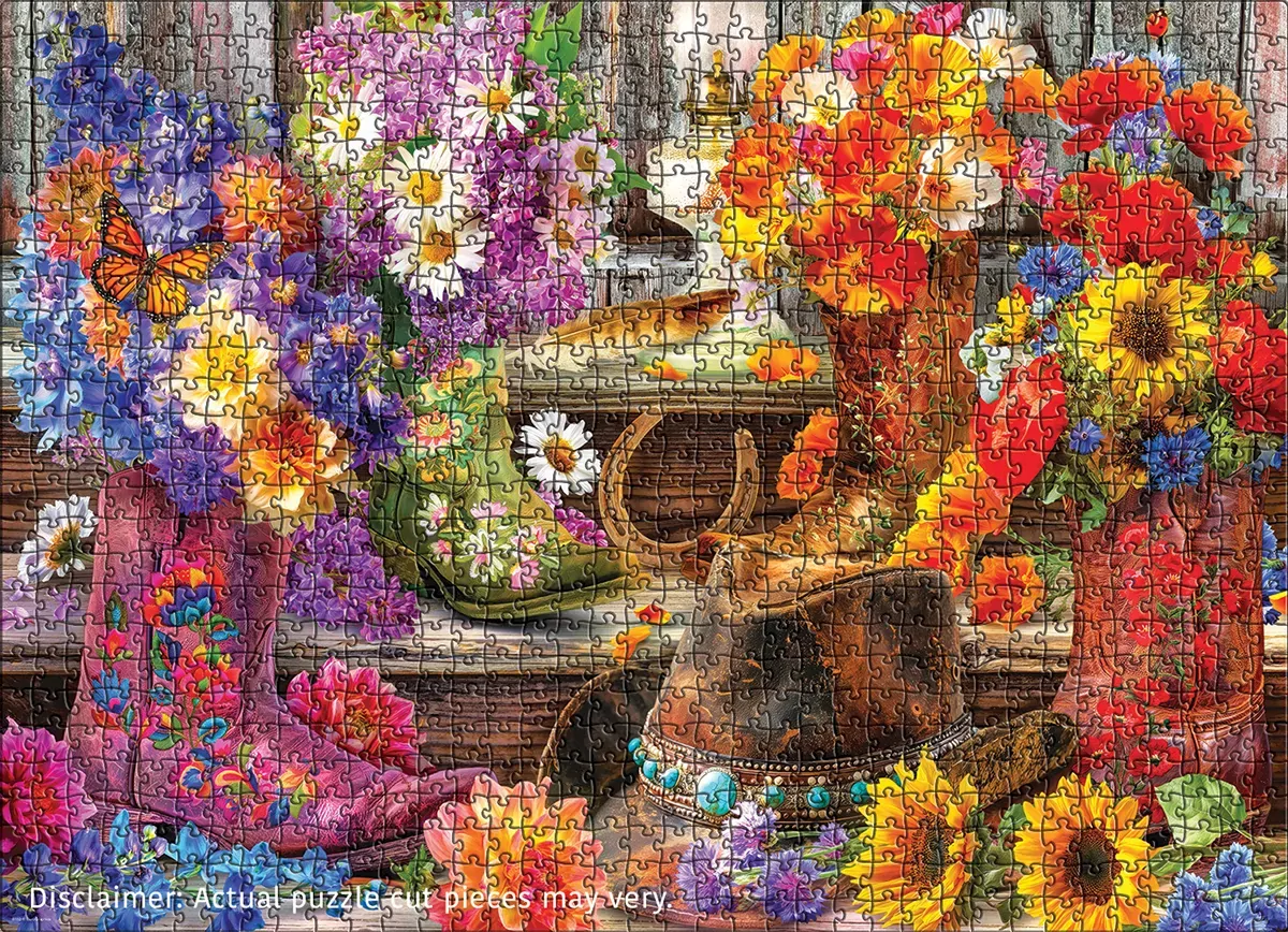 Kick up some country charm! Embroidered cowboy boots brim with sunflowers, poppies, lilacs, and daisies while a worn leather hat, lucky horseshoe, and farmhouse lantern set a warm, rustic mood. A vibrant, feel-good puzzle bursting with color and floral detail - perfect for anyone who loves western décor and cozy summer vibes.