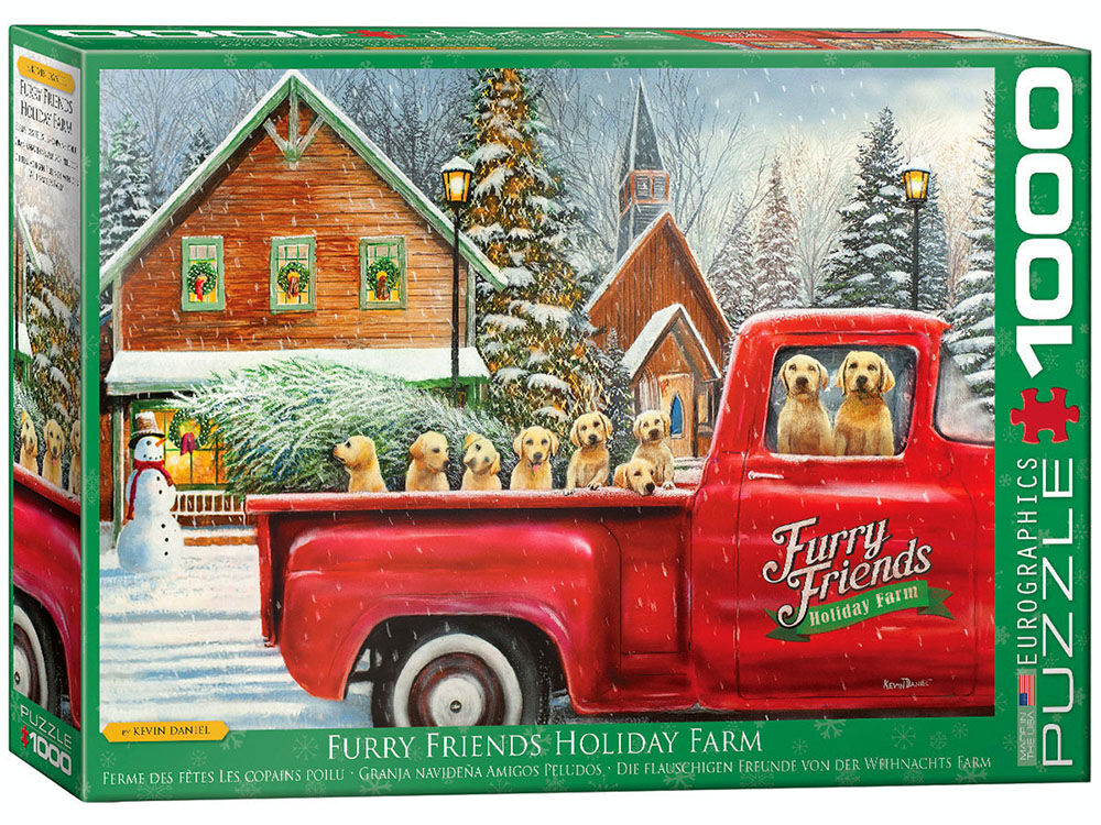 EuroGraphics Furry Friends Holiday Farm 1000-Piece Puzzle. Lab pups enjoying a holiday ride in back of vintage red pick up.