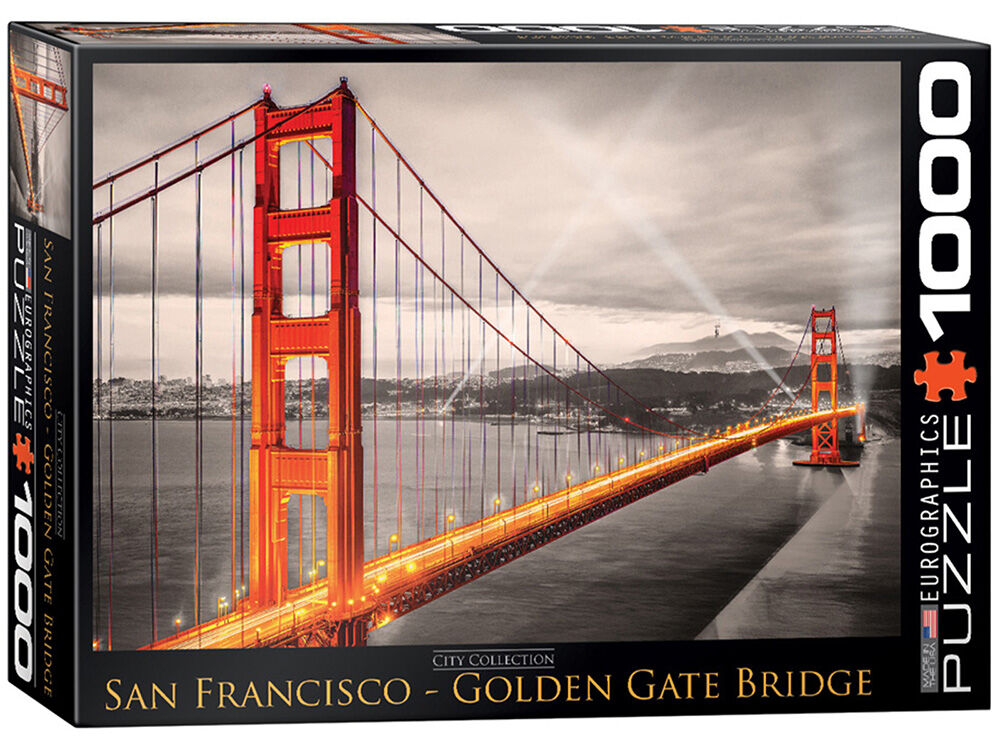 EuroGraphics San Francisco Golden Gate Bridge 1000-Piece Puzzle. Construct the Golden Gate Bridge piece-by-piece with this beautiful puzzle! The Golden Gate Bridge is a prominent American landmark and is the most well-known suspension bridge in the world. Spanning the Gold Gate Strait, the bridge connects the northern tip of San Francisco to Marin County. EUROGRAPHICS puzzles are both fun and educational. Puzzle pieces are made from 1.75mm blueboard, and are 100% recyclable, and printed with vegetable-based inks.