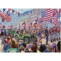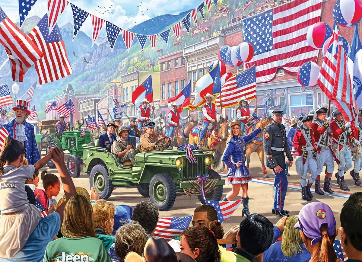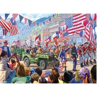 Celebrate classic Americana with Patriots Parade, a 1000-piece jigsaw puzzle that bursts with colour, movement, and pride. Marching bands, historic re-enactors, riders on horseback and cheering crowds line the streets as a convoy of iconic Jeep vehicles rolls past, decked out in flags and bunting.