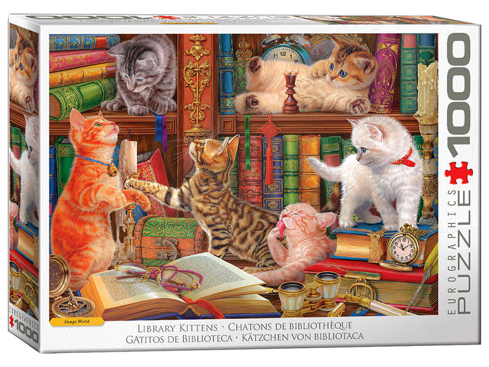 Step into the whimsical world of feline curiosity with the Library Kittens 1000-Piece Puzzle by Eurographics, featuring the delightful artwork of Image World! This charming puzzle captures a group of playful kittens exploring a grand library, surrounded by beautifully ornate books and vintage treasures.