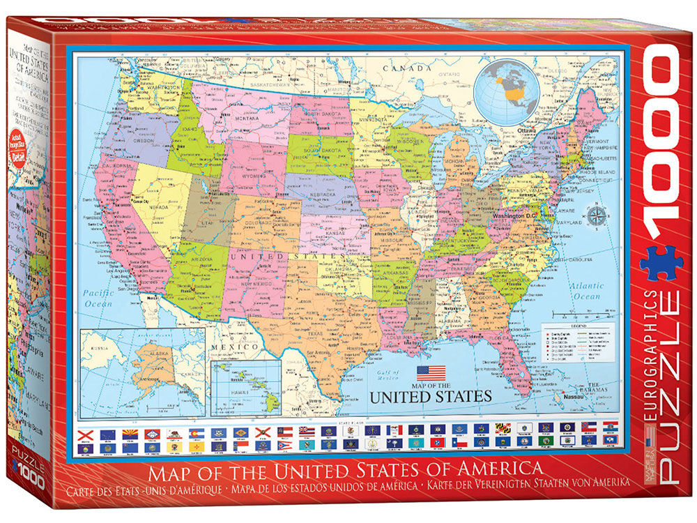 EuroGraphics Map of the United States of America 1000-Piece Puzzle. This educational map includes all major cities, as well as, the capital cities and state flags.