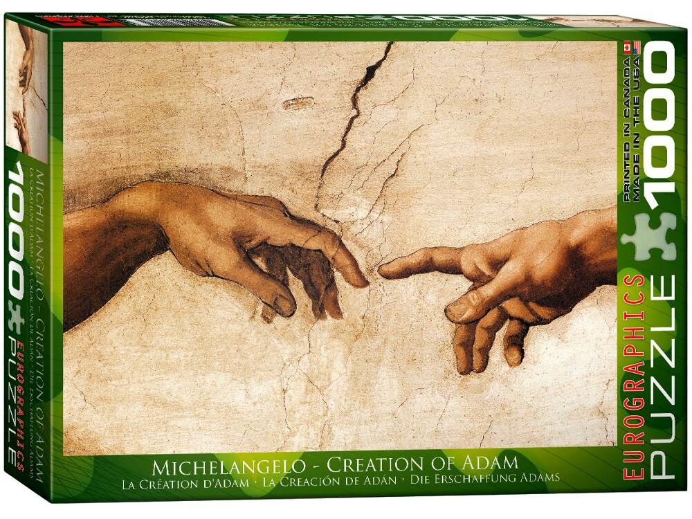 EuroGraphics Creation of Adam (Detail) by Michelangelo 1000-Piece Puzzle. The Creation of Adam is a fresco painting by Michelangelo, which forms part of the Sistine Chapel's ceiling, painted c. 15081512. It illustrates the Biblical creation narrative from the Book of Genesis in which God breathes.