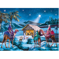 Experience the timeless beauty of the Christmas story with the The Three Kings 1000-Piece Puzzle by Eurographics, showcasing the captivating artwork of Macneil Studio. This exquisite puzzle depicts the Three Wise Men traveling beneath a shimmering, star-filled sky, guided by the radiant Star of Bethlehem to honor the newborn King with their gifts. Set against a serene desert landscape, the glowing nativity scene captures the reverence and wonder of this cherished biblical moment.
