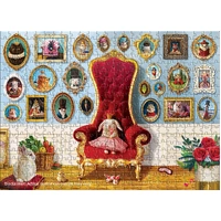 Step into a whimsical royal salon - art by Lucia Heffernan - where a bunny princess poses on a velvet throne, surrounded by a gallery wall of tiny, story-book portraits. Bold reds, gold frames, and pastel blues make every section pop, while hidden details keep puzzlers smiling. Large oversize pieces (500) are comfortable to pick up, perfect for family time or a relaxing evening.