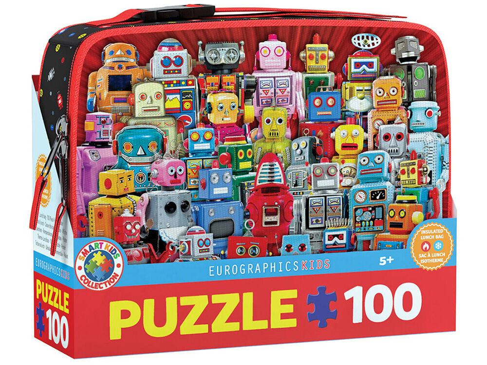 Eurographics Robots Lunch Bag 100-Piece Puzzle. Have fun putting together robots of all shapes and sizes! With over 50 robots, this puzzle will be a favorite for everyone!