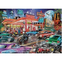 Fire up the nostalgia with Route 66 Diner a 1000-piece road-trip through America's most iconic highway. Under a moonlit desert sky, neon signs glow over a classic chrome diner, while muscle cars and rumbling motorcycles queue at vintage gas pumps.
