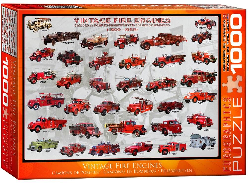 EuroGraphics Vintage Fire Engines 1000-Piece Puzzle. More than 35 antique fire engines are illustrated in this fascinating evolution of the fire engine throuhout the years 1909-1959. EUROGRAPHICS puzzles are both fun and educational. Puzzle pieces are made from 1.75mm blueboard, and are 100% recyclable, and printed with vegetable-based inks.