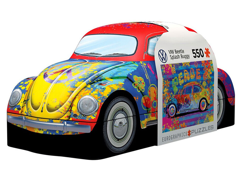 Celebrate peace, love, and iconic design with the VW Beetle Splash Tin 550-piece puzzle by Eurographics! This vibrant and colorful artwork features the beloved VW Beetle adorned with splashes of color, flowers, and peace symbols, bringing a nostalgic and fun vibe to your puzzling experience. Packaged in a unique embossed tin shaped like a VW Beetle, this puzzle is both a delightful challenge and a charming collectible.