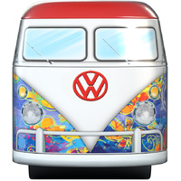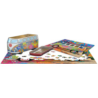 Retro paint splashed style puzzle celebrating the history of volkswagen bus. Puzzle stored inside VW bus shaped tin packaging.