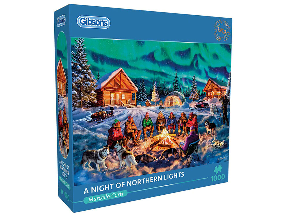 Gather around a crackling fire with a warm mug of cocoa in hand in this 1000 piece jigsaw by Marcello Corti. Friends share tales under the mesmerising northern lights. Meanwhile, husky dogs frolic in the snow, adding a touch of magic to this unforgettable Arctic adventure. As with all Gibsons jigsaws, we use 100% recycled puzzle board, FSC paper and work with the best artists from all around the world. The beautifully illustrated pieces are designed to fit perfectly together; in fact, we use the thickest puzzle board on the market.