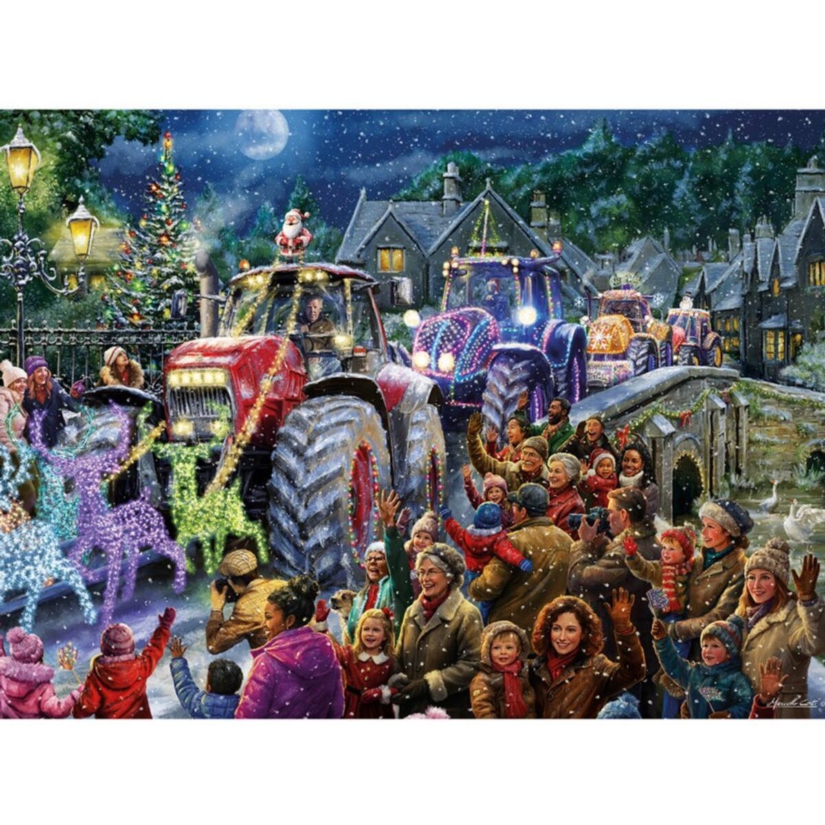 It's time to get revved up as Farmer Christmas himself rolls into town! Perfect for those that delight in the seasonal tradition of Christmas tractor parades - one thing is for certain, piecing this puzzle together is guaranteed to be more fun than mucking out the barn! This charming nighttime scene glows with fairy-light reindeer, guiding the way through the farm.