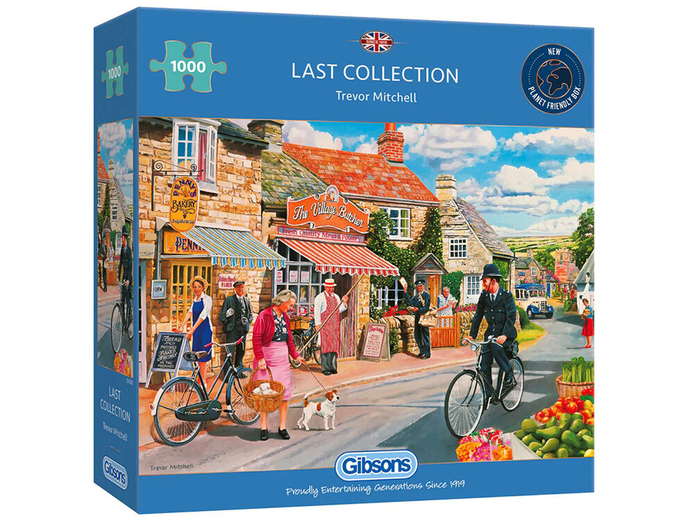 PC Smith is cycling through the village on his morning patrol. The smell of fresh bread sweeps down the road whilst the villagers are busy shopping for their daily essentials. The Postman is just finishing his round before he takes a well-deserved break with a cup of tea and a bun form the local Bakery! This 1000 piece puzzle has been painted by the talented artist Trevor Mitchell. Made in the UK. As with all Gibsons jigsaws, we use 100% recycled puzzle board, FSC paper and work with the best artists from all around the world. The beautifully illustrated pieces are designed to fit perfectly together; in fact, we use the thickest puzzle board on the market.