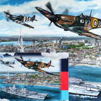 This painting, by internationally renowned aviation artist Matthew Emeny, features two iconic Spitfire aircraft flying over Portsmouth and the HMS Queen Elizabeth aircraft carrier being towed out of port.
