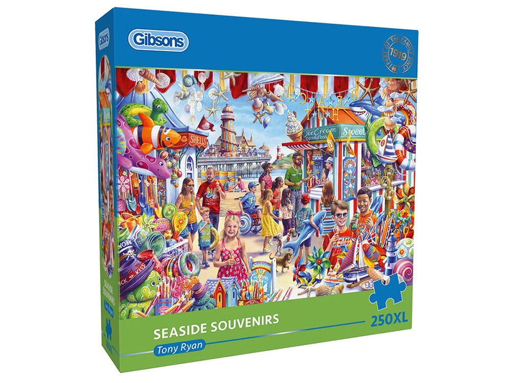 It's summer in this 250 XL piece jigsaw puzzle by Tony Ryan. First and foremost it's a trip to the beach for sandcastles, swimming, and a picnic lunch. Then, what better treat is there than to visit the promenade and explore the souvenir stalls to find something to remind us of our special day on the coast? As with all Gibsons jigsaws, we use 100% recycled puzzle board, FSC paper and work with the best artists from all around the world. The beautifully illustrated pieces are designed to fit perfectly together; in fact, we use the thickest puzzle board on the market.